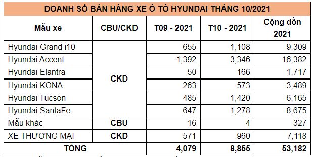 Tình hình kết quả bán hàng của Hyundai trong tháng 10/2021 có sự tăng trưởng đáng ghi nhận 117% so với tháng 9/2021. Kết quả này có được nhờ các biện pháp phòng chống dịch Covid-19 của chính phủ đã đạt những hiệu quả đáng kể, nhiều tỉnh, thành phố tăng cường các biện pháp thúc đẩy kinh tế. Đồng thời, nhu cầu mua và sử dụng xe ô tô của người dân nhằm có được phương tiện di chuyển an toàn trong mùa dịch được đáp ứng.