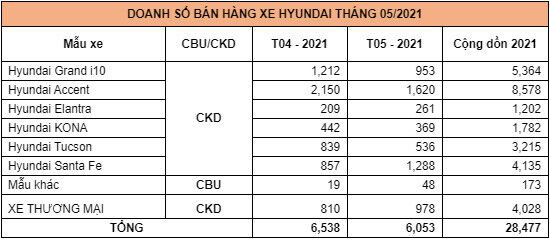 Tại Hà Nội, ngày 10/06/2021, TC MOTOR công bố kết quả bán hàng tháng 05/2021. Theo đó, tổng doanh số xe Hyundai tháng 5 đạt 6.053 xe, cộng dồn 28.477 xe 5 tháng đầu năm.