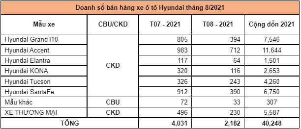 Tình hình kết quả bán hàng của Hyundai trong tháng 8/2021 có sự giảm mạnh so với các tháng trước đó (số bán chỉ bằng 54% so với tháng 7/2021). Nguyên nhân đó là lệnh giãn cách xã hội kéo dài trong cả tháng 8 được thực hiện tại nhiều tỉnh thành phố trên cả nước do Covid-19 tiếp tục có những diễn biến phức tạp. Điểm đáng ghi nhận là số bán tính từ đầu năm đến hết tháng 8/2021 của các mẫu xe Hyundai đạt 40,248 xe, tương đương với các con số của cùng kì năm 2020.
