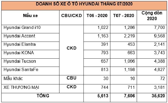 Hyundai Accent dẫn đầu về doanh số với mức tăng trưởng đột phá 90.7%, với 2,219 xe đến tay khách hàng, cộng dồn 9,568 xe trong 7 tháng đầu năm. Grand i10 giữ vị trí thứ 2 với 1,286 xe bán ra trong tháng 7, cộng dồn 7,700 xe.