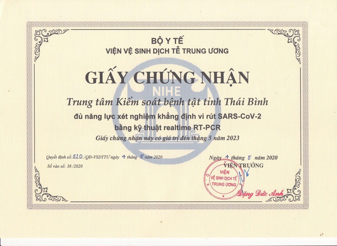 Tính đến 17 giờ ngày 14/5, tổng số mẫu đã xét nghiệm trên địa bàn tỉnh Thái Bình là 3.237 mẫu, trong đó Trung tâm CDC tỉnh thực hiện xét nghiệm 2.386 mẫu. Ngày 4/5/2020 vừa qua, Trung tâm CDC tỉnh Thái Bình đã được Viện Vệ sinh dịch tễ Trung ương cấp Giấy chứng nhận đủ năng lực xét nghiệm khẳng định vi-rút SARS-CoV-2 bằng kỹ thuật realtime RT-PCR. Theo đánh giá của Viện Vệ sinh Dịch tễ Trung ương, Trung tâm CDC tỉnh Thái Bình có đủ điều kiện về an toàn sinh học của phòng xét nghiệm, trang thiết bị, cơ sở vật chất và đội ngũ cán bộ đáp ứng về trình độ chuyên môn, năng lực để thực hiện xét nghiệm vi-rút SARS-CoV-2.