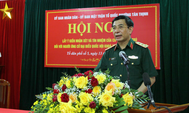Thượng tướng Phan Văn Giang, Ủy viên Bộ Chính trị, Bộ trưởng Bộ Quốc phòng phát biểu tại Hội nghị tiếp xúc cử tri.