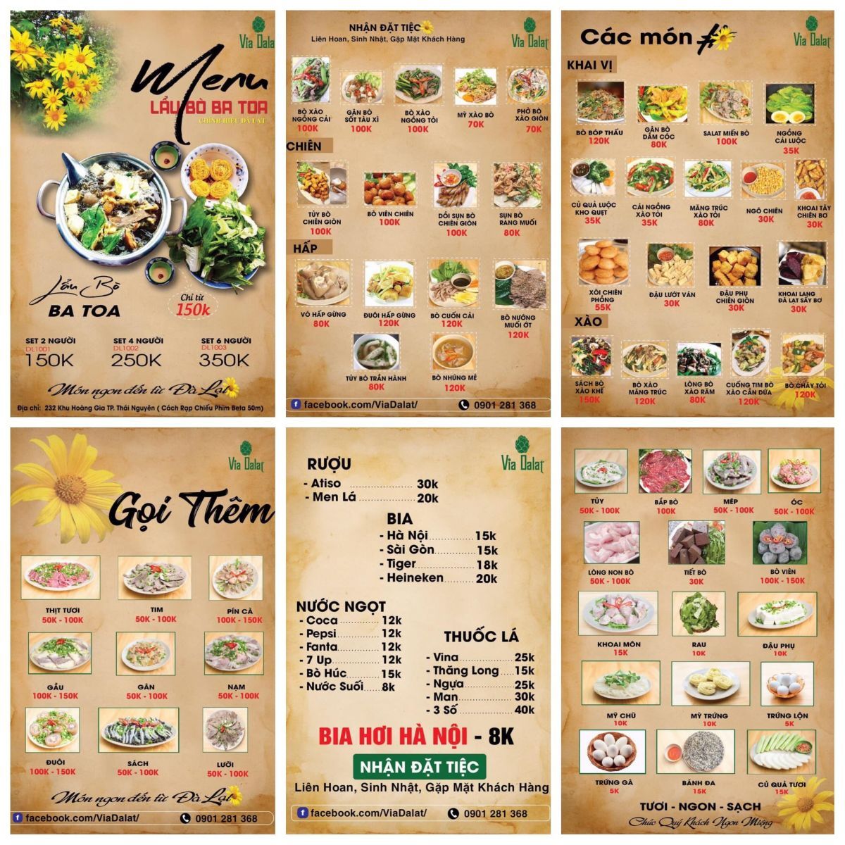 Nếu không gian thu hút khách hàng tới thì chính là số lượng các món ăn được chế biến từ thịt bò cực kỳ đa dạng mới là thứ giữ chân khách ở lại với Lẩu Bò Ba Toa. Với tiêu chí sự ngon miệng của khách hàng chính là niềm vui, Via Dalat - Lẩu Bò Ba Toa luôn chú trọng đến giá trị dinh dưỡng cũng như sự đa dạng trong các bữa ăn của mình. Thực đơn của nhà hàng bao gồm các món lẩu bò, gỏi bò, các món nướng, món nhậu từ bò,…Nhưng Lẩu bò được khách order nhiều nhất vì nước lẩu được chế biến đậm đà, thơm ngon. Lẩu bò sẽ được nấu chín sẵn và chỉ đợi để phục vụ thực khách, bạn sẽ có ba loại để lựa chọn, lẩu nhỏ khoảng 2 người ăn, lẩu 4 người ăn và lẩu cho 6 người ăn. Một nồi lẩu như vậy cũng chiều lòng thực khách với đầy ắp thịt bò. Loại bò núi thơm mềm, càng ăn càng ngọt càng ngon này đã đánh gục vị giác biết bao thực khách. Từ đuôi bò, gân bò, xí quách, cho đến gầu, nạm, bắp … đều có trong nồi lẩu, mỗi phần thịt đều có vị ngon riêng, đưa người thưởng thức đi từ bất ngờ này đến bất ngờ khác. Miếng bò ở đây thái dày, to bản, chứ không mỏng tang, ấy thế những độ mềm mại thì vẫn còn nguyên chứ không khô không cứng. Tất cả phần thịt đều được làm chín từ trong bếp, đến lúc có khách, chủ quán chỉ dọn ra cùng nồi nước lẩu nghi ngút là đã thưởng thức ngay được rồi.