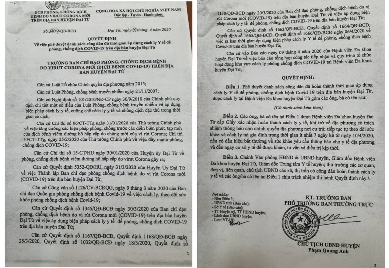 Quyết định về việc phê duyệt danh sách công dân đủ thời gian áp dụng cách ly Y tế để phòng, chống dịch COVID-19 trên đại bàn huyện Đại Từ