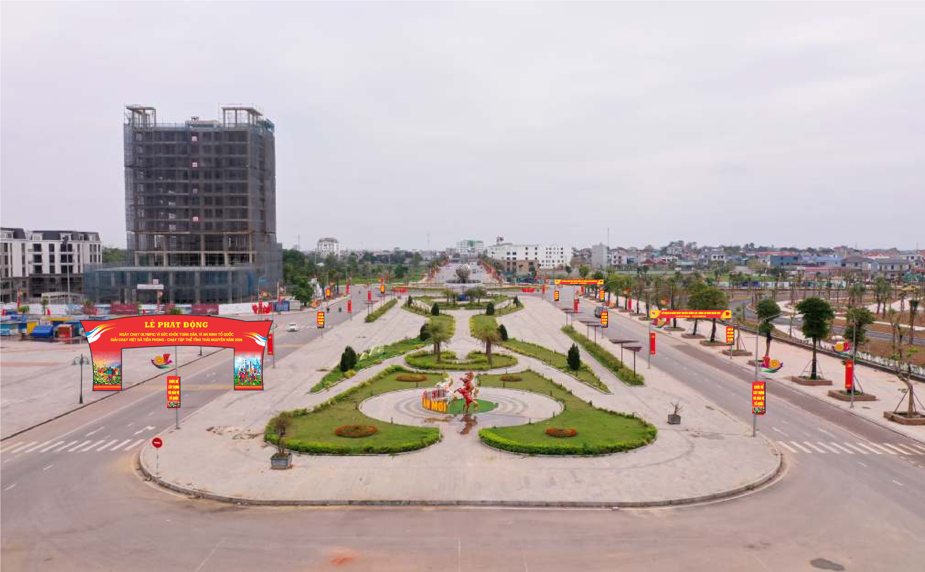 Không gian trung tâm Quảng trường Vạn Xuân được lắp đặt pano, băng rôn, cổng chào dọc các tuyến đường, tạo khí thế sôi nổi trước ngày diễn ra sự kiện.