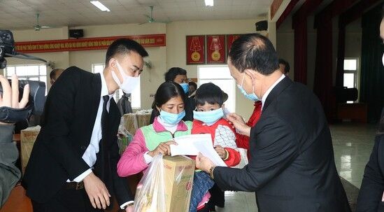 Đại diện Công ty cổ phần cơ khí ô tô 19/5 - Nhà phân phối ô tô Mitsubishi Thanh Hoá trao quà tết cho người dân xã Đồng Tiến