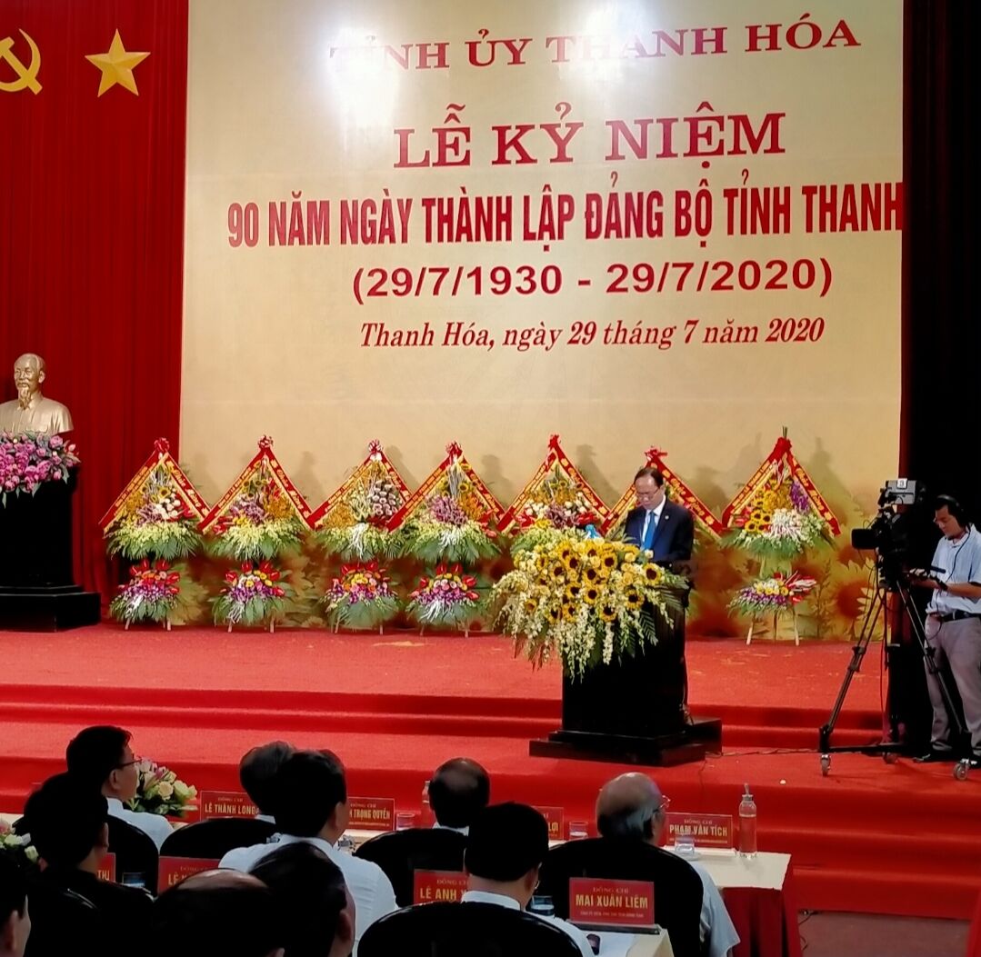 Phát biểu tại buổi lễ, đồng chí Phạm Minh Chính, Ủy viên Bộ Chính trị, Bí thư Trung ương Đảng, Trưởng ban tổ chức Trung ương ghi nhận và đánh giá cao về những thành tựu mà Đảng bộ và nhân dân các dân tộc tỉnh Thanh Hóa đã đạt được trong suốt chặng đường 90 qua, đặc biệt là trong mười năm ngần đây Thanh hóa đã khai thác và phát huy tốt các tiềm năng, lợi thế vào phát triển kinh tế, xã hội. Tuy nhiên Thanh Hóa hiện vẫn còn nhiều khó khắn, thách thức cần được tháo gỡ để sớm trở thành tỉnh kiểu mẫu và công nghiệp hiện đại.