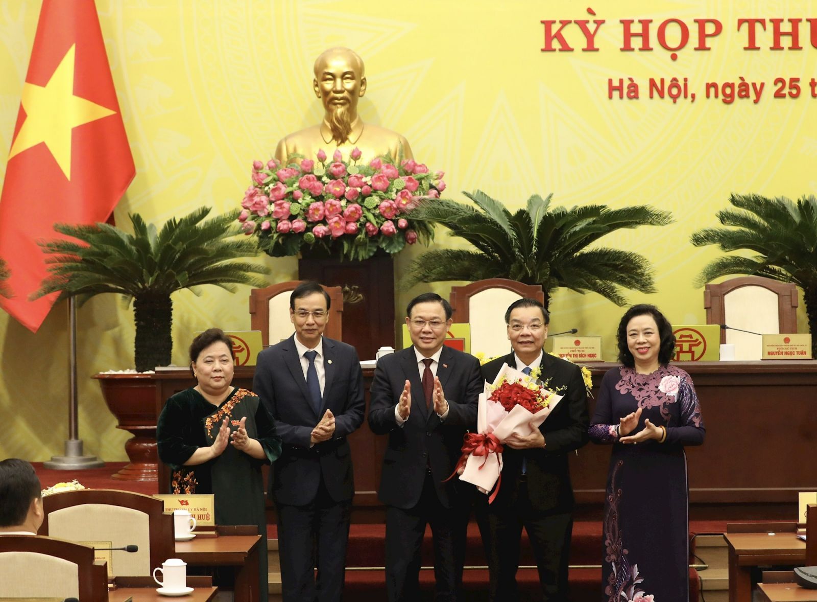 Các đồng chí lãnh đạo Thành phố Hà Nội tặng hoa chúc mừng tân Chủ tịch UBND Thành phố Hà Nội Chu Ngọc Anh.