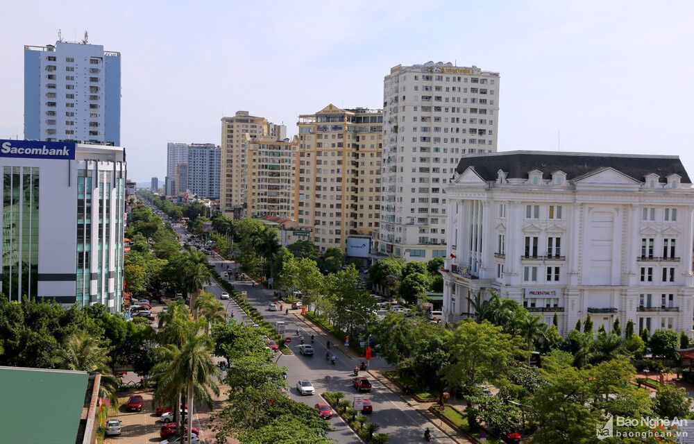 Phố Quang Trung, thành phố Vinh rợp bóng cây xanh với những công trình cao tầng, hiện đại. Ảnh: Thu Huyền