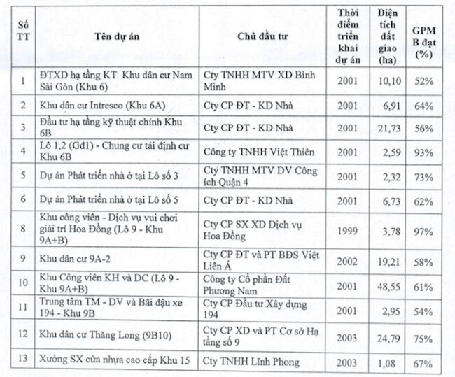 Thanh tra Chính phủ vừa kiến nghị Thủ tướng xem xét thu hồi 13 dự án tại TP.HCM đã giao đất từ những năm 1999-2003 nhưng đến nay chưa hoàn thành việc giải phóng mặt bằng (GPMB) chưa thực hiện nghĩa vụ tài chính, chưa đầu tư xây dựng.