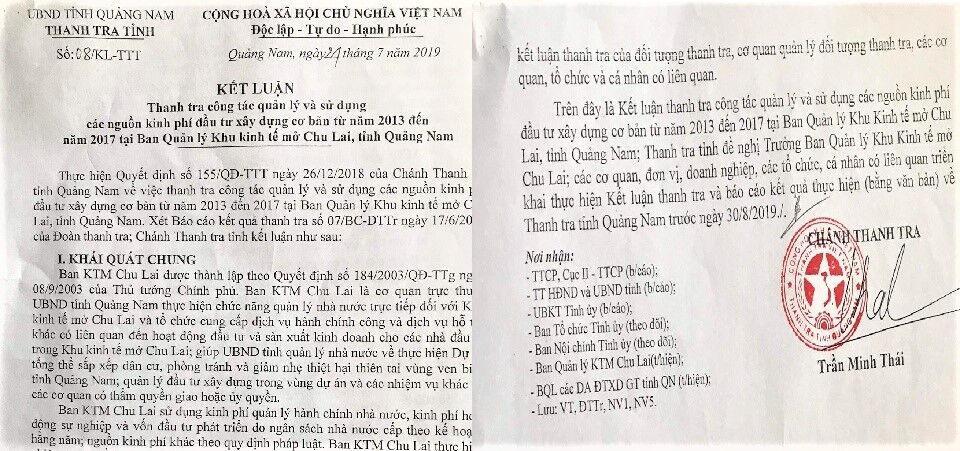 Kết luận thanh tra số 08/KL-TTT do Chánh Thanh tra Trần Minh Thái ký, đã chỉ ra hàng loạt sai phạm ở ban Quản lý KKT mở Chu Lai