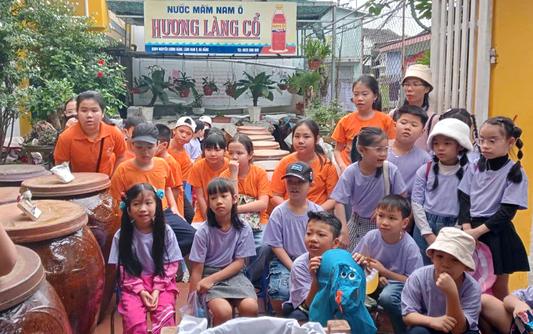 Học sinh địa phương tham quan xưởng nước mắm Nam Ô của thầy Phú