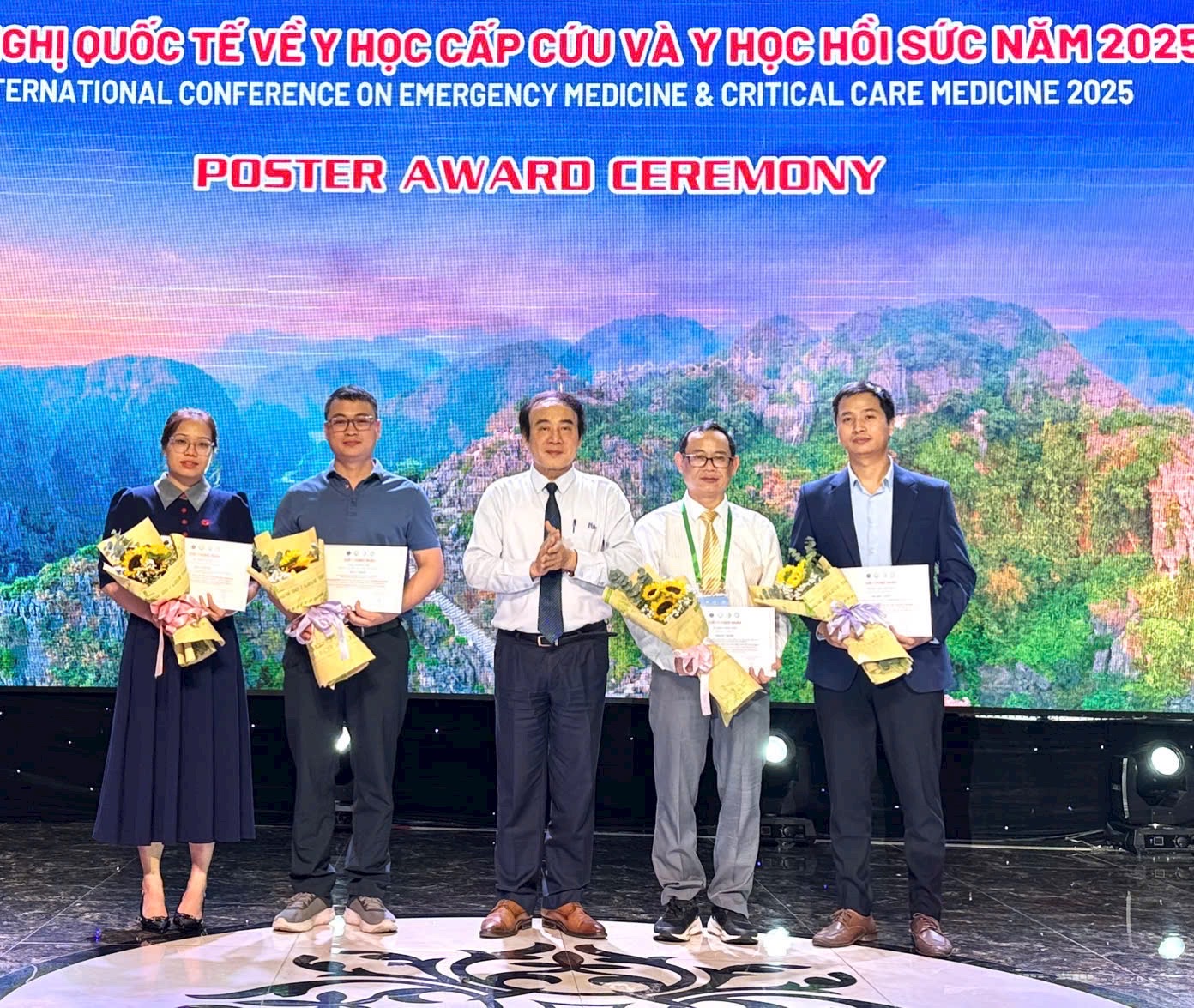 PGS.TS. Nguyễn Văn Chi trao chứng nhận các tác giả đạt giải thưởng poster tại Hội nghị quốc tế về Y học cấp cứu và Y học hồi sức năm 2025.
