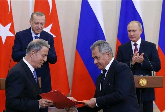 Bộ trưởng Quốc phòng Thổ Nhĩ Kỳ và Nga ký bản ghi nhớ về việc thuận thiết lập một khu phi quân sự tại tỉnh Idlib dưới sự chứng kiến của lãnh đạo hai nước. Ảnh: Anadolu Agency