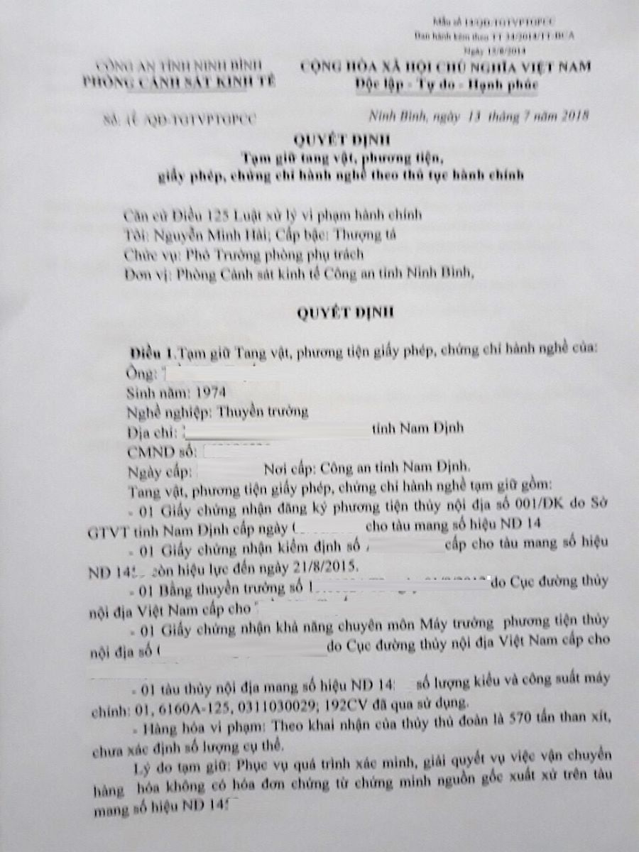 Cùng ngày, Thượng tá Nguyễn Minh Hải - Phó Trưởng Phòng phụ trách Phòng PC03 - Công an Ninh Bình đã ký Quyết định số 16/QĐ-TGTVPTGPCC tạm giữ phương tiện là tàu NĐ14xx cùng tang vật (gồm 488m³ than xít nghiền, 01 giấy chứng nhận đăng ký phương tiện thủy nội địa cấp cho tàu NĐ14xx, 01 giấy chứng nhận kiểm định, 01 bằng thuyền trưởng của chủ tàu, 01 giấy chứng nhận khả năng chuyên môn máy trưởng) do không xuất trình được hóa đơn chứng minh nguồn gốc xuất xứ hàng hóa, đồng thời giao cho Trung tá Trần Thế Công- Đội trưởng tổ chức xác minh, xử lý.