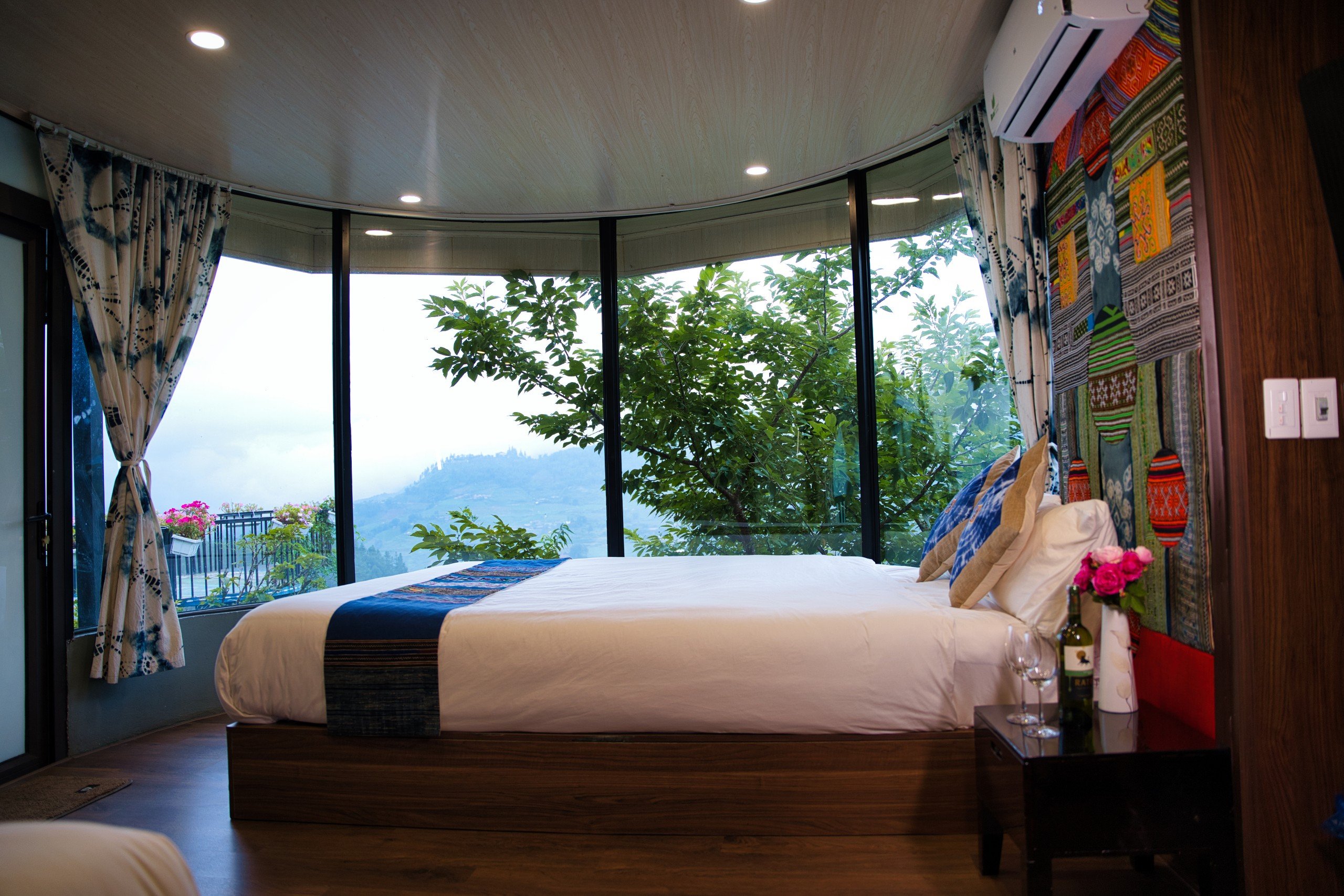 Mỗi bungalow đều có ban công riêng, nơi du khách có thể ngắm nhìn toàn cảnh núi non hùng vĩ và những thửa ruộng bậc thang xanh mướt. Buổi sáng, bạn có thể thức dậy trong tiếng chim hót líu lo và không khí trong lành của vùng núi cao. Buổi tối, bạn có thể thư giãn trong ánh đèn vàng ấm áp, tận hưởng không gian yên bình.