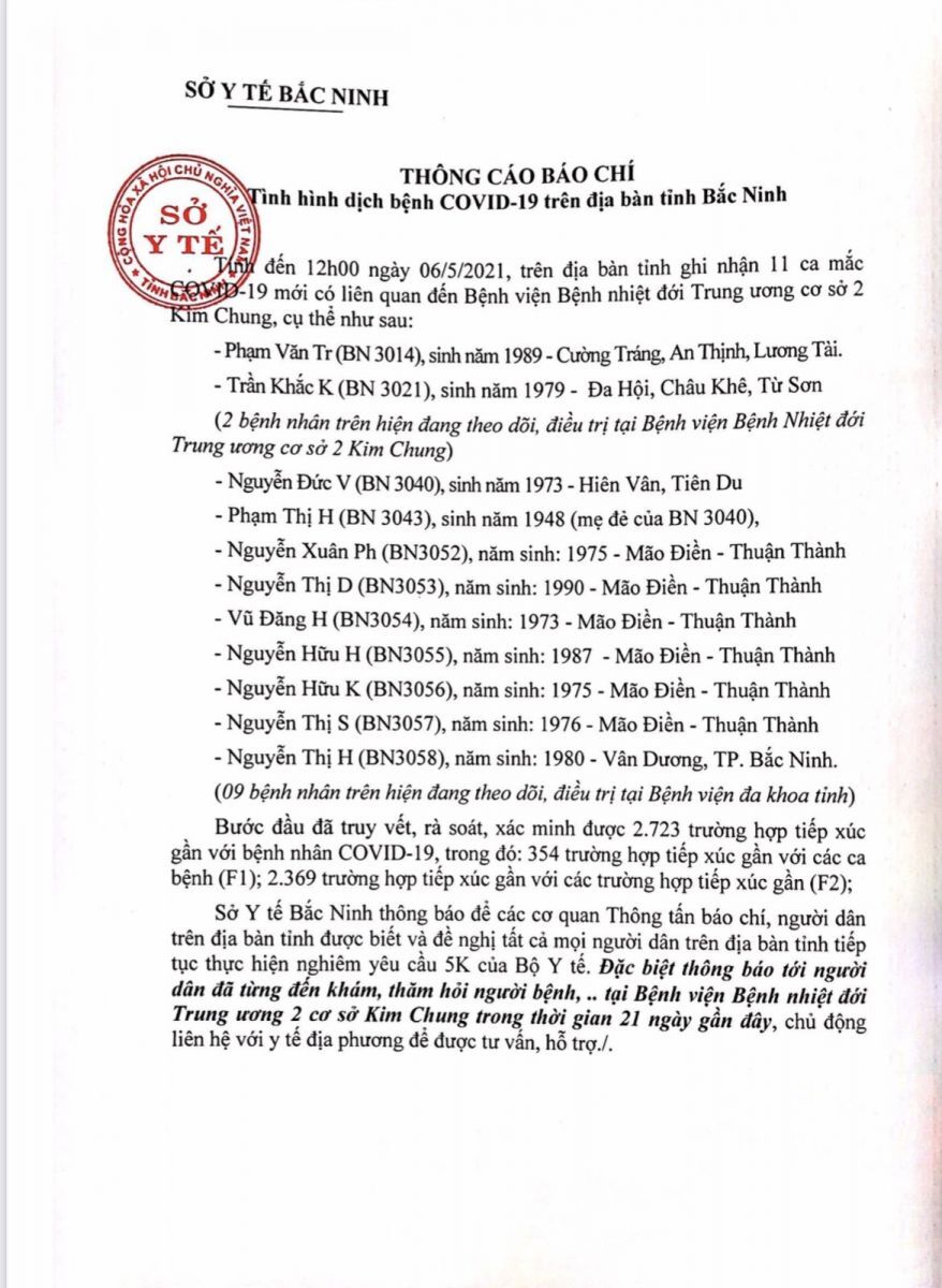 Theo đó, tính đến 12h00 ngày 06/5/2021, trên địa bàn tỉnh Bắc Ninh ghi nhận 11 ca mắc COVID-19 mới có liên quan đến Bệnh viện Bệnh nhiệt đới Trung ương cơ sở 2 Kim Chung.
