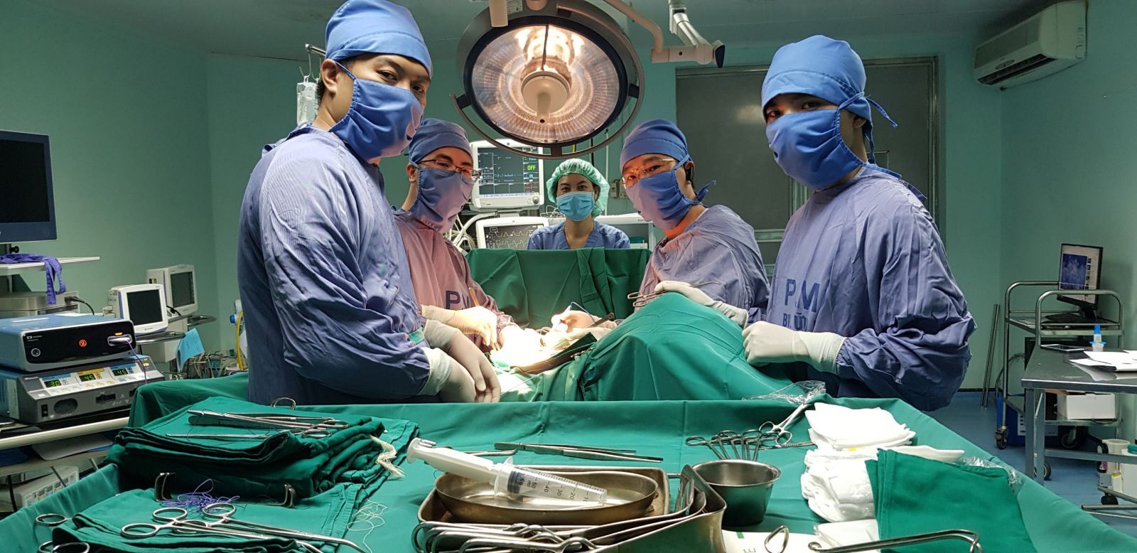 ThS.BS. Nguyễn Hồng Long (thứ hai từ phải qua) cùng đồng nghiệp phẫu thuật nội soi cho người bệnh.