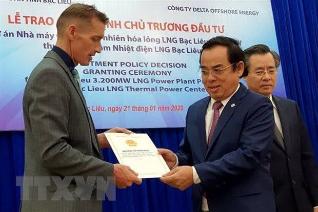 Ông Dương Thành Trung, Chủ tịch Ủy ban Nhân dân tỉnh Bạc Liêu trao quyết định chủ trương đầu tư cho Dự án Nhà máy điện khí tự nhiên hóa lỏng Bạc Liêu. (Ảnh: Huỳnh Sử/TTXVN)