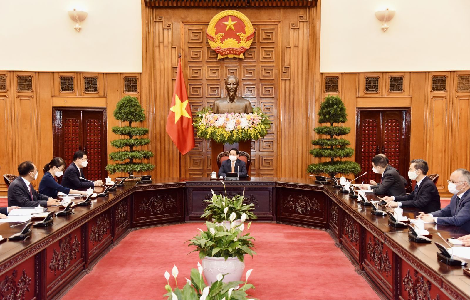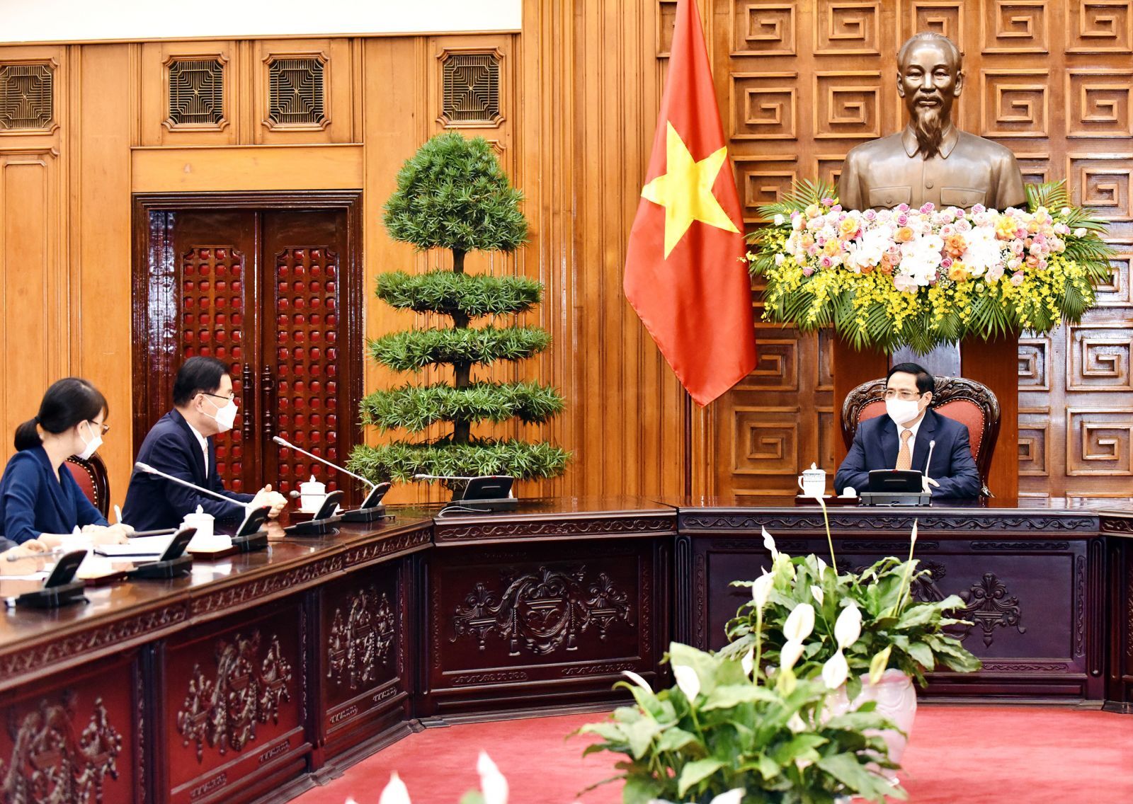 Thủ tướng Chính phủ Phạm Minh Chính đề nghị Việt Nam và Hàn Quốc sớm hoàn thành mục tiêu nâng kim ngạch thương mại song phương lên 100 tỷ USD theo hướng cân bằng, bền vững, hiệu quả; đồng thời đề nghị Hàn Quốc có chính sách ưu tiên chia sẻ nguồn vaccine COVID-19, xem xét hỗ trợ Việt Nam nghiên cứu, sản xuất vaccine và các sinh phẩm, trang thiết bị khác…