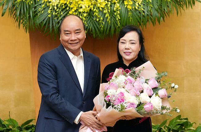Thủ tướng Nguyễn Xuân Phúc tặng hoa nguyên Bộ trưởng Bộ Y tế Nguyễn Thị Kim Tiến - Ảnh: VGP/Quang Hiếu