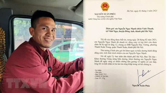 Trước đó, Thủ tướng Chính phủ Nguyễn Xuân Phúc đã có thư khen gửi anh Nguyễn Ngọc Mạnh, người dũng cảm cứu cháu bé 3 tuổi bị ngã từ tầng 12 chung cư.