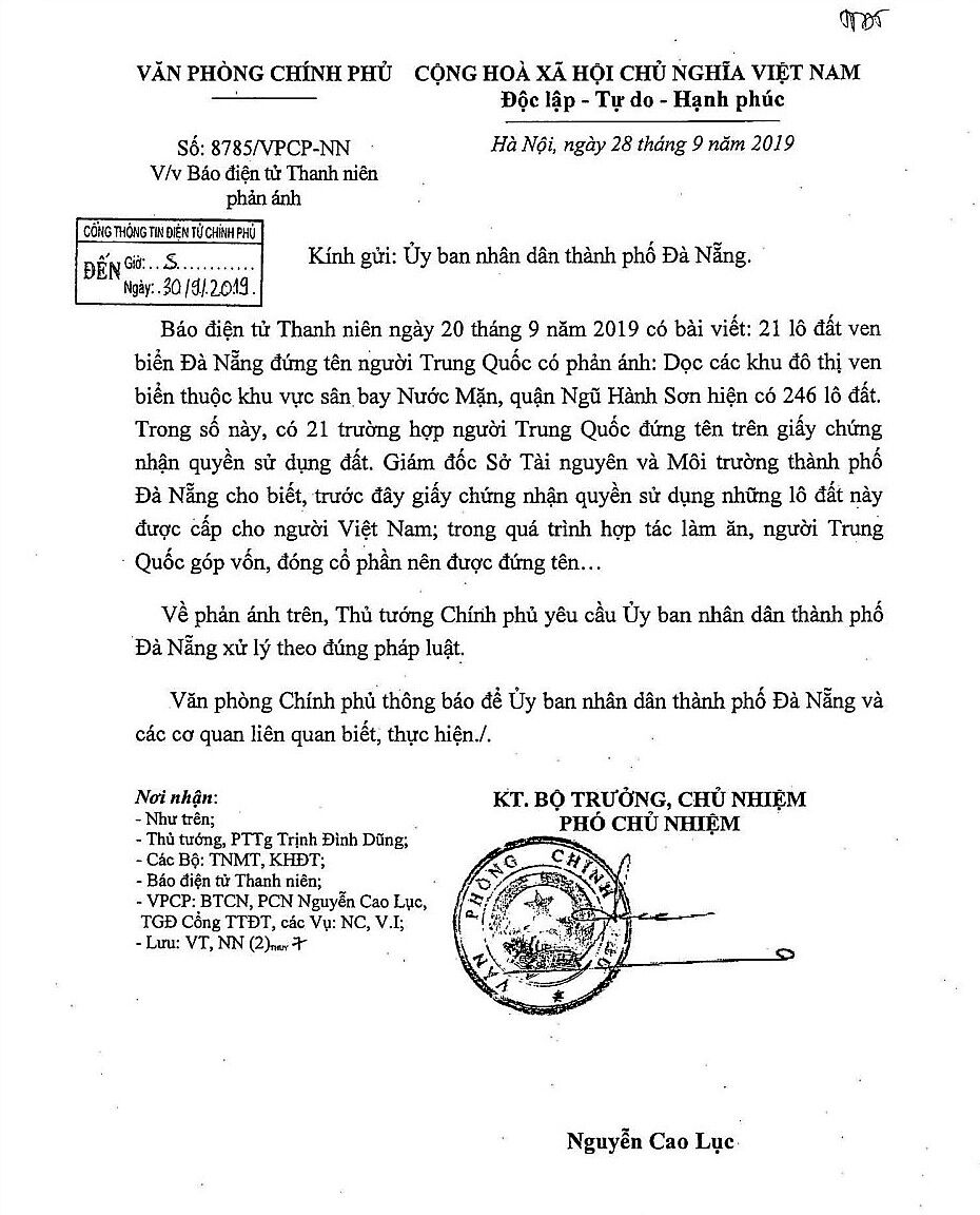 Công văn Số 8785/VPCP-NN truyền đạt ý kiến của Thủ tướng Nguyễn Xuân Phúc về thông tin có 21 trong 246 lô đất thuộc các khu đô thị ven biển quanh khu vực sân bay Nước Mặn (Q.Ngũ Hành Sơn) hiện có người Trung Quốc đứng tên sở hữu phản ảnh trên Báo Thanh Niên ngày 20/9 vừa qua.