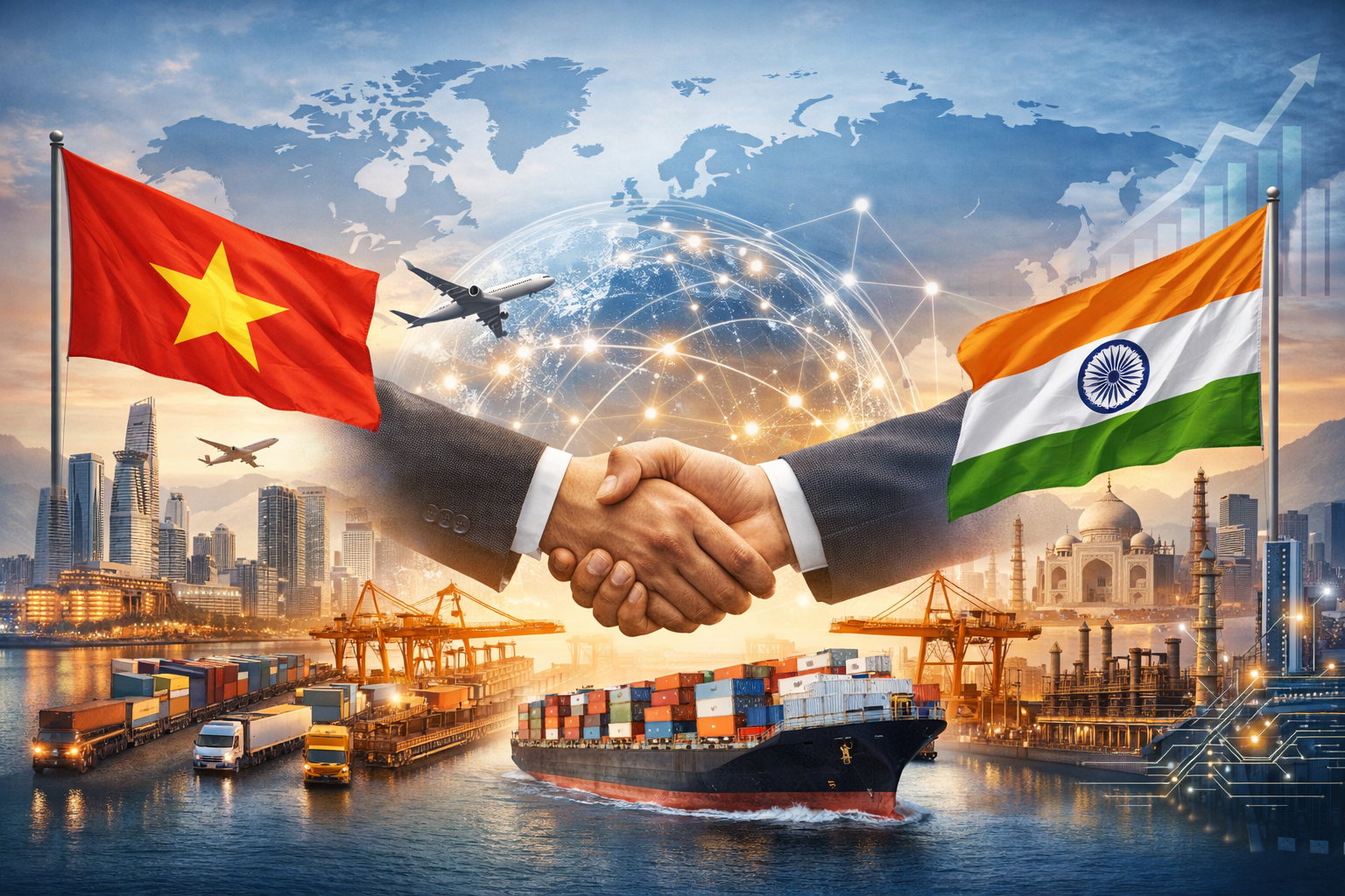 Đối với Việt Nam và Ấn Độ, hai nền kinh tế có tốc độ tăng trưởng cao tại châu Á, quá trình tái cấu trúc chuỗi giá trị toàn cầu vừa đặt ra yêu cầu thích ứng, vừa mở ra cơ hội thúc đẩy hợp tác theo chiều sâu. Việt Nam đang từng bước khẳng định vai trò là một trung tâm sản xuất và xuất khẩu quan trọng tại Đông Nam Á, với lợi thế về vị trí địa kinh tế, lực lượng lao động và mức độ hội nhập thông qua các hiệp định thương mại tự do. Trong khi đó, Ấn Độ nổi lên như một nền kinh tế lớn với tiềm lực đáng kể trong các lĩnh vực công nghệ thông tin, dược phẩm, năng lượng, công nghiệp chế tạo và thị trường nội địa quy mô lớn. Sự khác biệt về cơ cấu kinh tế giữa hai quốc gia tạo ra tính bổ trợ tương đối rõ nét, qua đó mở ra khả năng mở rộng hợp tác trong các lĩnh vực có giá trị gia tăng cao.