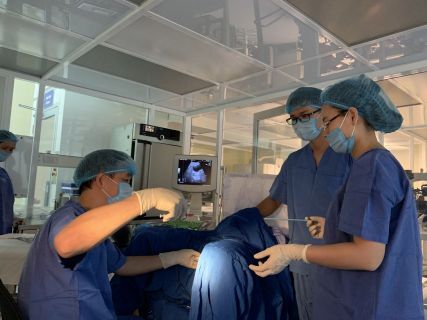 PGS.TS Trịnh Thế Sơn đang chuyển phôi vào tử cung cho bệnh nhân.