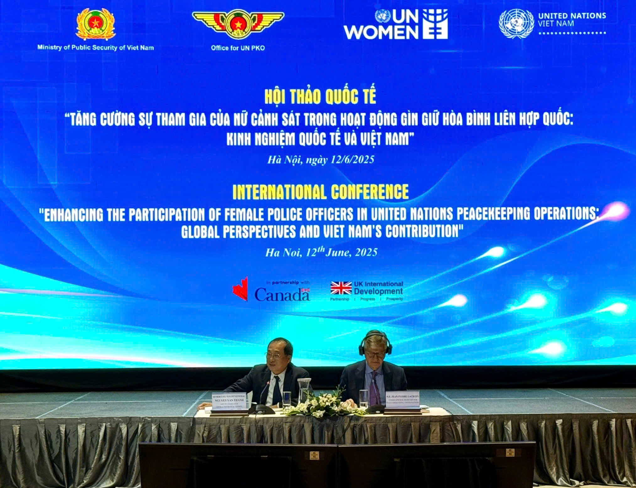 Thượng tướng, GS.TS.Nguyễn Văn Thành (bên trái ảnh) đồng chủ trì Hội thảo khoa học quốc tế "Tăng cường sự tham gia của nữ cảnh sát trong hoạt động gìn giữ hòa bình Liên hợp quốc: Kinh nghiệm quốc tế và Việt Nam", tổ chức tại Hà Nội, tháng 06/2025