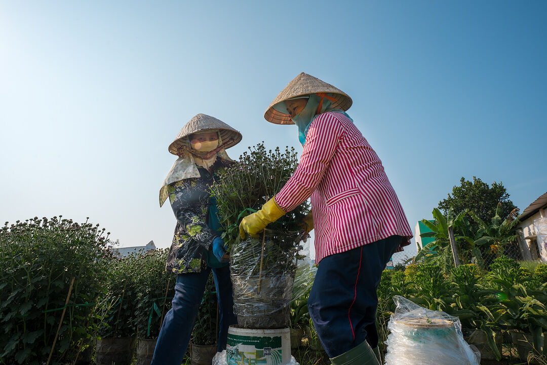 Tại làng hoa những ngày cuối năm, công việc tất bật, mọi người đều hỗ trợ nhau