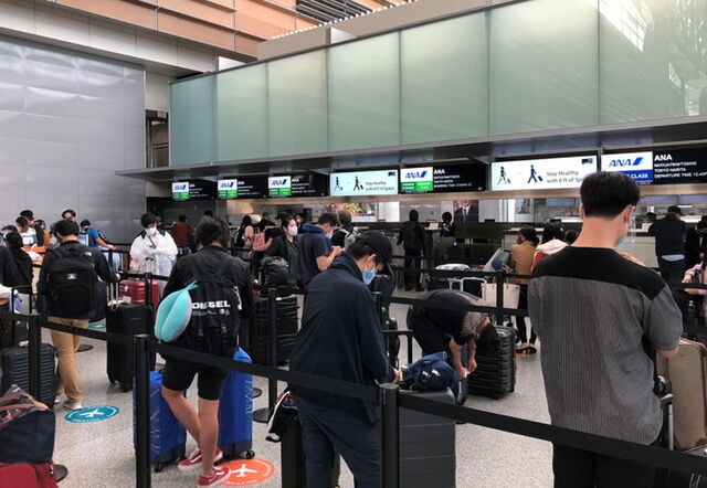 Công dân làm thủ tục lên máy bay tại sân bay Narita (Tokyo, Nhật Bản).