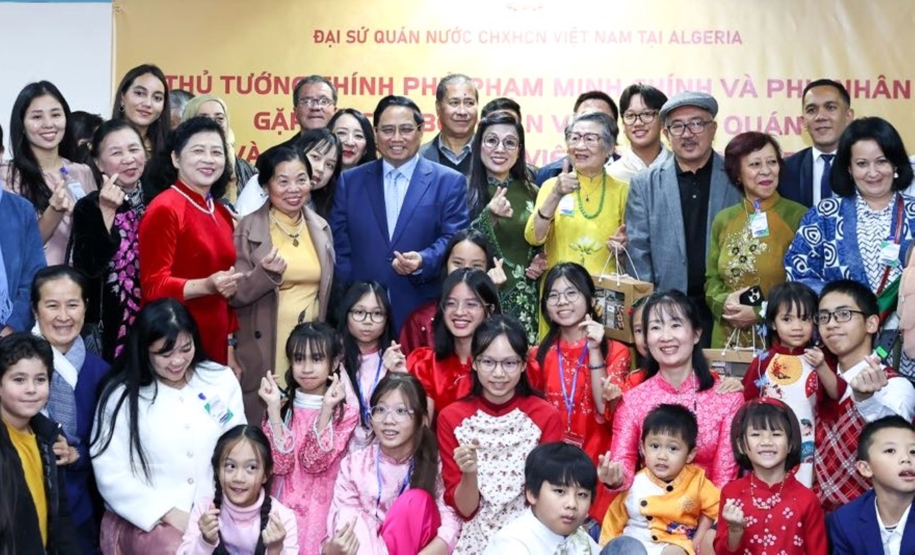 Phát biểu tại cuộc gặp mặt, Thủ tướng Phạm Minh Chính bày tỏ xúc động khi cảm nhận được "tình dân tộc, nghĩa đồng bào"-tài sản vô giá của đất nước ta trong mọi hoàn cảnh; chuyển những tình cảm thân thiết, lời thăm hỏi, chúc sức khỏe, chúc mừng tốt đẹp của Tổng Bí thư Tô Lâm, các đồng chí lãnh đạo Đảng, Nhà nước tới cộng đồng người Việt Nam tại Algeria.