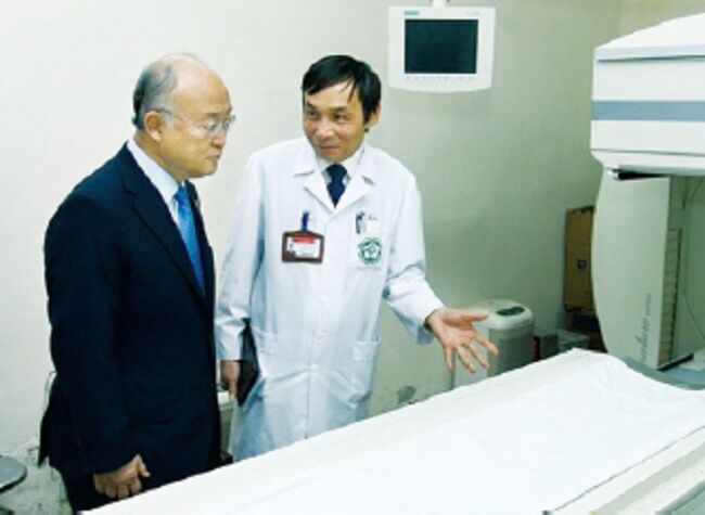 GS.TS.TTND. Mai Trọng Khoa đang trao đổi chuyên môn tại Bệnh viện Bạch Mai với Tổng Giám đốc Cơ quan năng lượng nguyên tử quốc tế (IAEA) Yukiya Amano