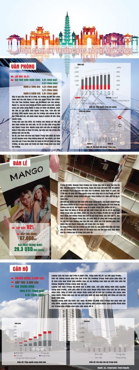 VNHN - JLL Việt Nam vừa đưa ra báo cáo về thị trường bất động sản Hà Nội với một số điểm đáng chú ý: Tỷ lệ lấp đầy phân khúc văn phòng đạt 92,3%, tỷ lệ lấp đầy mặt bằng bán lẻ: 92%, phân khúc căn hộ tăng giá 0,5% (theo quý) và 6,9% (theo năm).