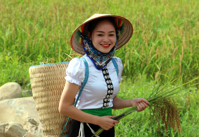 Thiếu nữ Thái ngắt những bông lúa nếp buổi sớm tham gia Lế hội cốm.