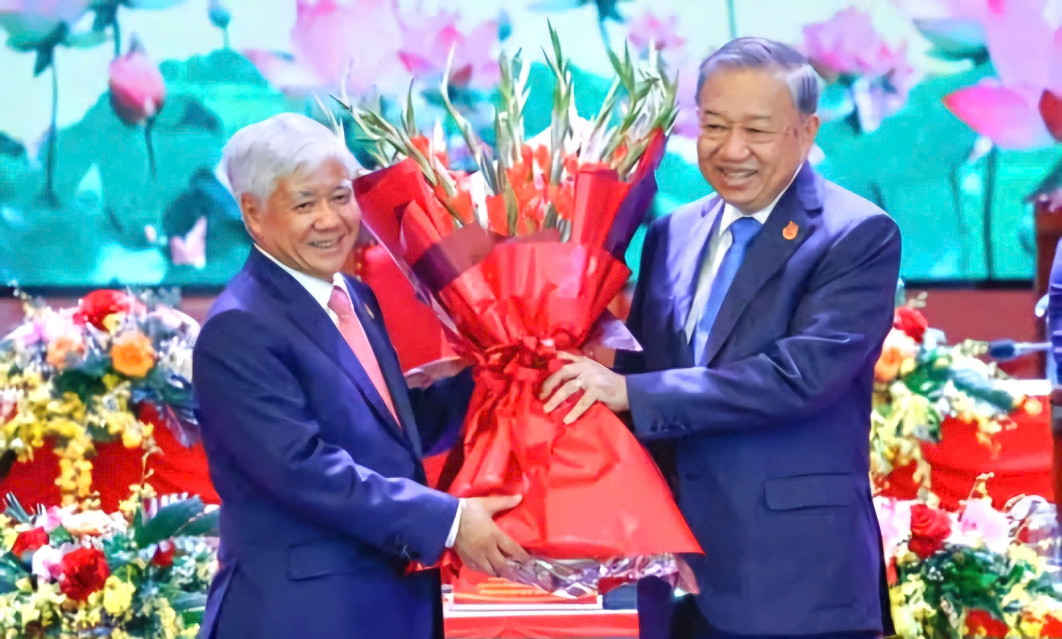 Tổng Bí thư Tô Lâm tặng hoa chúc mừng đồng chí Đỗ Văn Chiến, Ủy viên Bộ Chính trị, Bí thư Trung ương Đảng, Bí thư Đảng ủy Mặt trận Tổ quốc, các đoàn thể Trung ương, Chủ tịch Ủy ban Trung ương Mặt trận Tổ quốc Việt Nam. Ảnh: TL