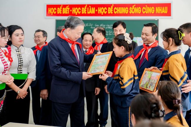 Tổng Bí thư Tô Lâm thăm lớp học, động viên thầy và trò trường liên cấp Si Pa Phìn. Ảnh: Ánh Dương