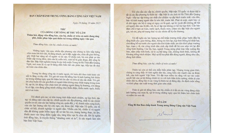 Tổng Bí thư Tô Lâm gửi Thư thăm hỏi, động viên đồng bào, cán bộ, chiến sĩ trên cả nước đang ứng phó, khắc phục hậu quả thiên tai trong những ngày vừa qua.