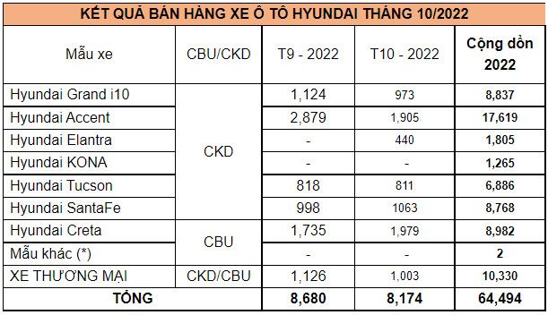Doanh số bán hàng các mẫu xe Hyundai trong tháng 10/2022 (Đơn vị: Xe)