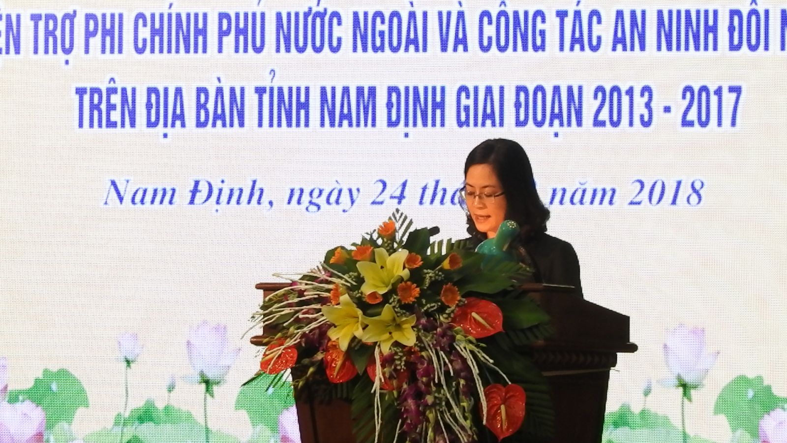 Đồng chí Chu Thị Hồng Loan – Phó Chánh văn phòng UBND tỉnh Nam Định báo cáo tổng kết chương trình quốc gia xúc tiến vận động viện trợ PCPNN