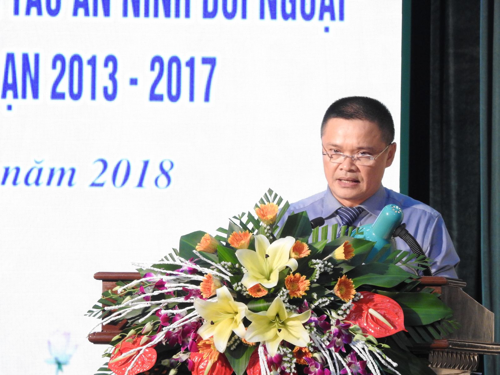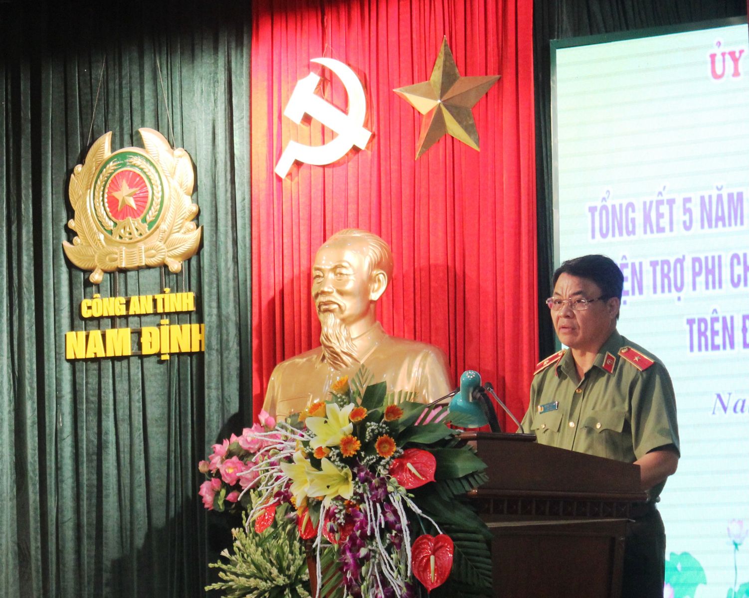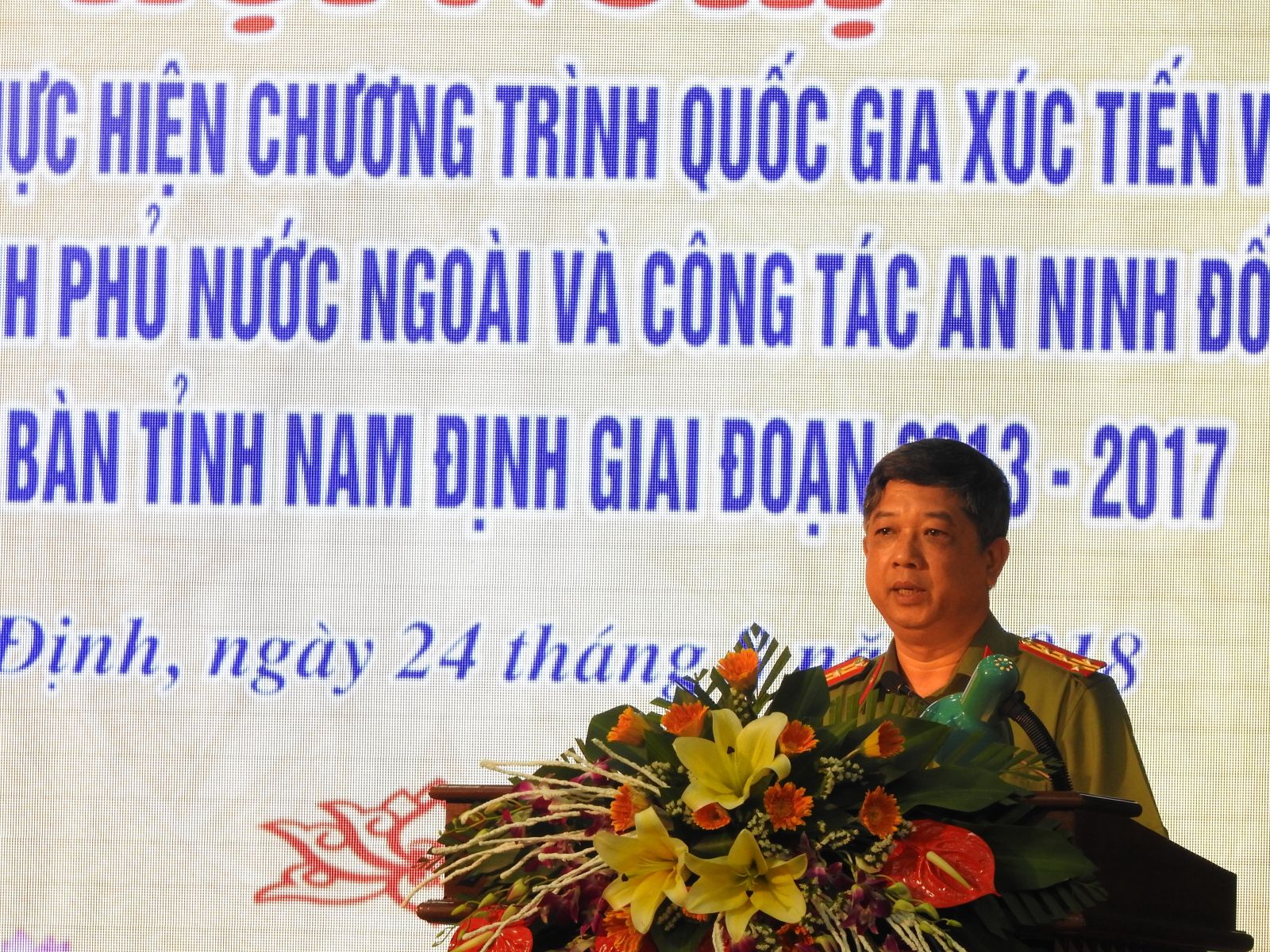 Thiếu tướng Đặng Văn Sinh – UVBTV Tỉnh ủy, Giám đốc Công an tỉnh Nam Định báo cáo tổng kết 5 năm về hoạt động an ninh đối ngoại