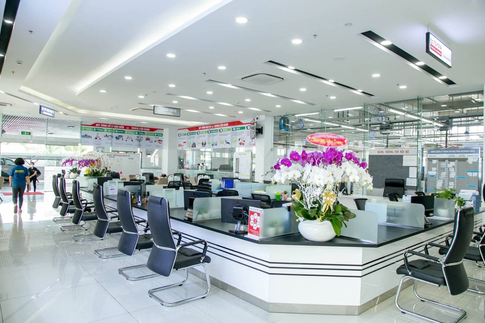 Bà Trân: TOYOTA Tiền Giang có diện tích xây dựng gần 10.000m2, gồm 3 khu vực chính: phòng trưng bày sản phẩm, khu vực phòng chờ dành cho khách hàng, và xưởng dịch vụ. Trong đó, xưởng dịch vụ có tổng cộng 56 khoang (14 khoang bảo dưỡng và sửa chữa chung, 42 khoang sửa chữa đồng sơn). Ngoài ra còn có 20 khoang khác phục vụ cho các dịch vụ tăng cường.