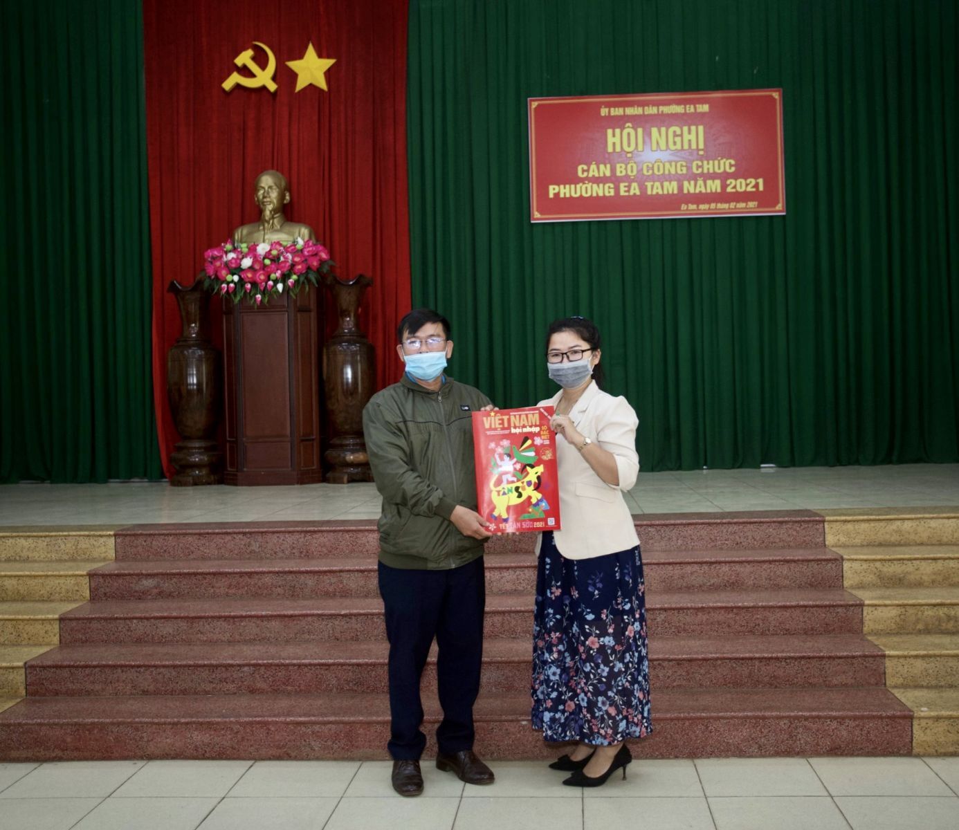 Nhà báo Nguyễn Hương cũng đã gửi tặng đến lãnh đạo các xã, phường những cuốn tạp chí Xuân của Tạp chí Việt Nam Hội nhập.(Ảnh Bảo Lâm)