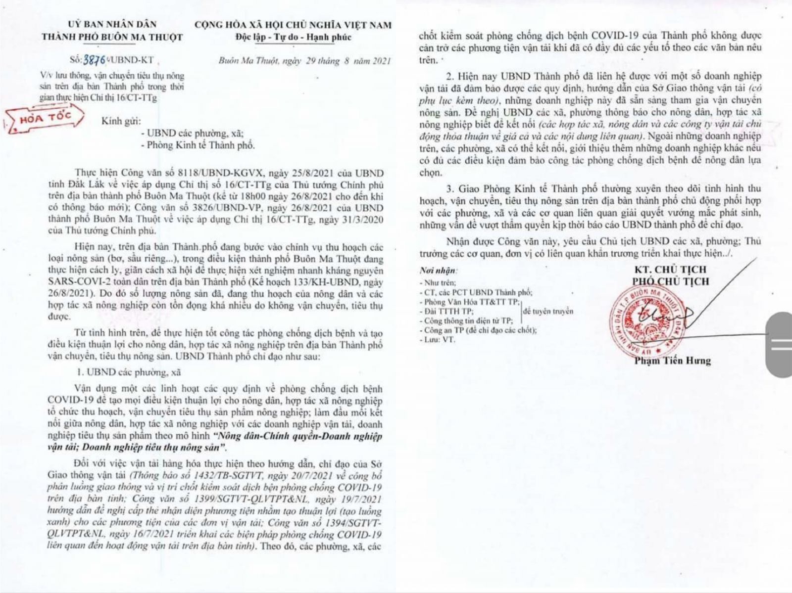 Ngày 29/8, Chủ tịch UBND thành phố Buôn Ma Thuột Vũ Văn Hưng cho biết: Thành phố đã ban hành công văn hỏa tốc về việc, vận chuyển tiêu thụ nông sản trên địa bàn trong thời gian thực hiện Chỉ thị 16/CT - TTg.
