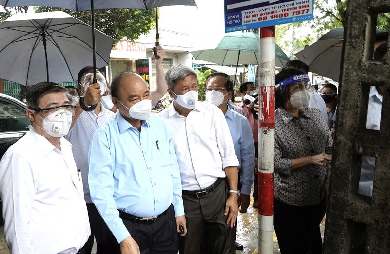 Chủ tịch nước Nguyễn Xuân Phúc thăm người dân trong khu phong tỏa tại thị trấn Hóc Môn, huyện Hóc Môn, TP Hồ Chí Minh.