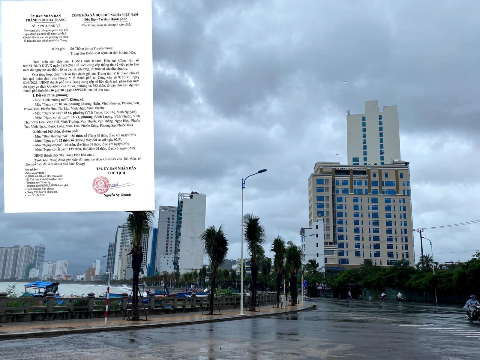 Chiều ngày 3/9/2021 UBND thành phố Nha Trang đã có công văn số 5791/UBND- VP về việc cung cấp thông tin phân loại kết quả đánh giá mức độ nguy cơ dịch Covid-19 của các xã , phường và thôn, tổ trên địa bàn Thành phố Nha Trang ngày 3/9.