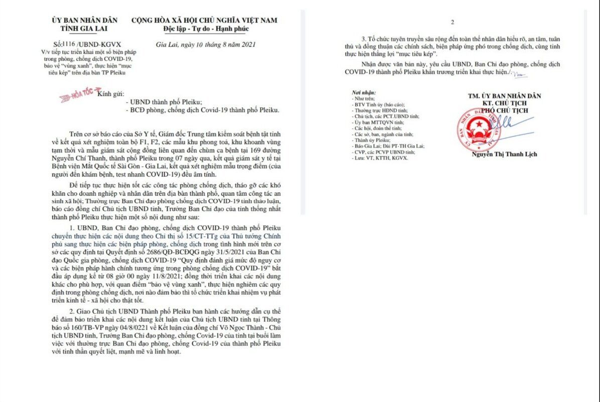 UBND, Ban Chỉ đạo phòng, chống dịch COVID-19 thành phố Pleiku chuyển thực hiện các nội dung theo Chỉ thị số 15/CT-TTg của Chính phủ sang thực hiện các biện pháp phòng, chống dịch trong tình hình mới trên cơ sở các quy định tại Quyết định số 2686/ QĐ-BCĐQG ngày 31/5/2021 của Ban Chỉ đạo Quốc gia phòng, chống dịch COVID-19 “Quy định đánh giá mức độ nguy cơ và các biện pháp hành chính tương ứng trong phòng chống dịch COVID-19” bắt đầu áp dụng kể từ 08 giờ 00 ngày 11/82021; đồng thời triển khai các nội dung khác cho phù hợp, với quan điểm "bảo vệ vùng xanh", thực hiện nghiêm các quy định trong phòng chống dịch, nơi nào đảm bảo thì tổ chức triển khai nhiệm vụ phát triển kinh tế - xã hội cho thật tốt.