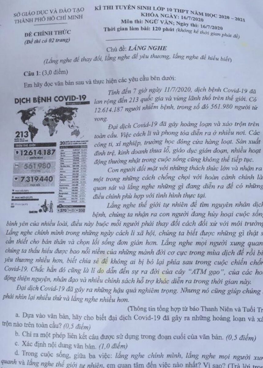 Đề thi môn Ngữ văn năm nay được đánh giá là mang tính thời sự về đại dịch Covid-19 với chủ đề “Lắng nghe” :Thấu hiểu, lắng nghe để thay đổi, lắng nghe để yêu thương và chia sẻ.