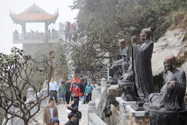 Giữa biển mây bồng bềnh quyện vào núi xanh thẳm, hình dáng những nếp chùa Việt thế kỷ 15-16 bình an đứng giữa chân mây, nơi đất và trời giao hòa thành một. Đi dọc Đường La Hán nơi những gốc đỗ quyên hàng trăm năm tuổi thân mốc màu thời gian đã bắt đầu bật nụ, du khách sẽ tới được Đại Tượng Phật A Di Đà, nơi lưu giữ Xá lợi Phật linh thiêng, hay ở mỏm đá hướng ra đại ngàn bao la, tượng Phật Quan Thế Âm Bồ Tát từ bi nhìn xuống bao dung và độ lượng. Ở nơi trang trọng mà thanh tịnh ấy, du khách và Phật tử tìm thấy sự bình an sâu thẳm trong tâm hồn. Và đó là khoảnh khắc ai cũng ước ao ngày Tết đến, xuân sang.